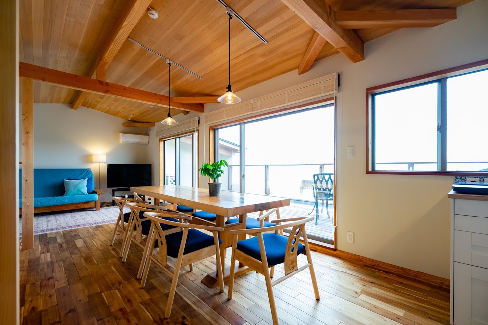 玄関から入るとキッチン、ダイニング、リビングのある階になります。ダイニングは長いテーブルがあり、最大10名様で囲むこととができます。